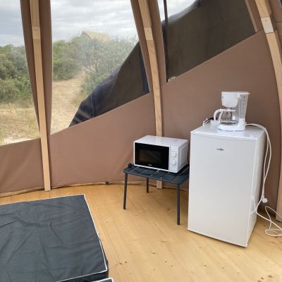 Tente dressée sur une jolie terrasse en bois au milieu de la nature avec vue sur la mer. 4 couchages.