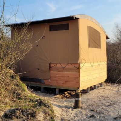 Il s'agit d'un petit logement de bois qui permet de se reposer au calme après une bonne journée de randonnée. Vous pouvez placer vélos, tables et chaises sous le cabanon qui est monté sur pilotis.
